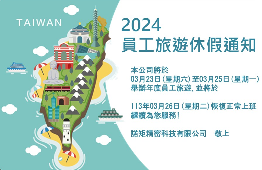 本公司將於3/23(六)-3/25(一)舉辦年度員工旅遊旅遊期間將暫停服務及進出貨作業。若有不便之處敬請見諒!