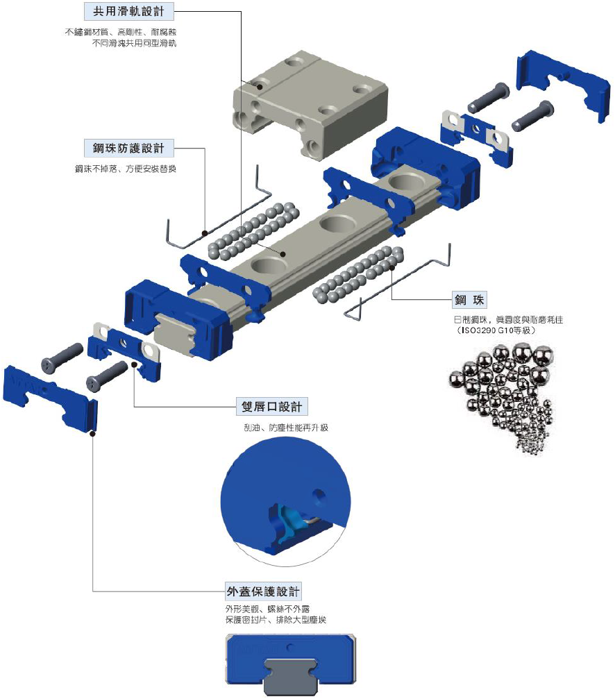 線性滑軌係為一種滾動導引,藉由鋼珠在滑塊與滑軌之間作無限滾動循環,負載平台能沿著滑軌輕易地以高精度作線性運動。